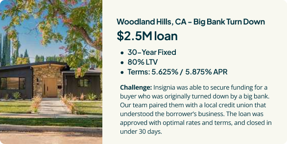 Insignia connected the borrower with a local credit union that understood their unique business structure. The loan was approved with optimal terms and closed in under 30 days.